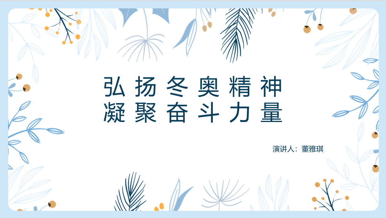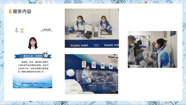 董雅琪同学是国家跳台滑雪中心媒体运行业务领域志愿者,宣讲的内容为培训活动、服务内容、冬奥精神,共三个部分。