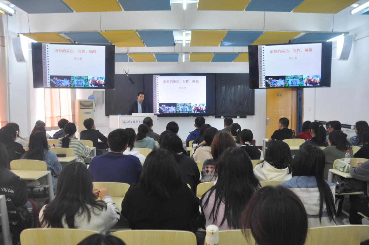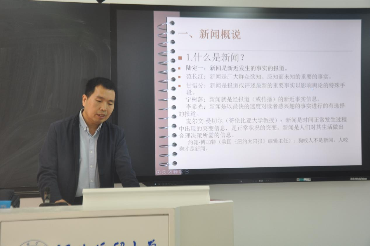 栗占勇老师此次讲座从新闻的定义、消息的特征、消息的采访、消息的写作、消息的编辑以及消息的真实性六部分,分别进行了讲述。