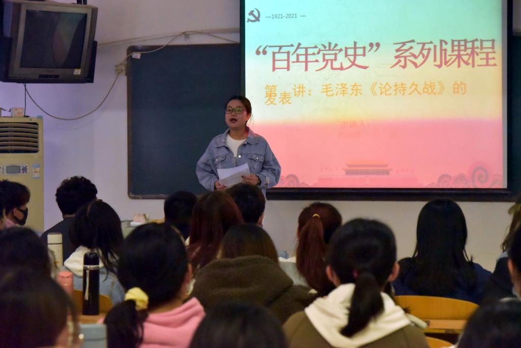 4月7日上午,外国语公司党委组织师生200余人分班开展本学期线下“开学第一课”,及时开展党史学习教育。课程伊始,刘会娟指出:“学史明理、学史增信、学史崇德、学史力行是总书记在党史学习教育动员大会上的明确要求,同学们要通过一系列党史学习教育的开展,牢记历史、不忘过去,牢固树立‘热爱祖国、热爱党、热爱社会主义’的家国情怀”。随后,参加公司思政微课堂--百年党史系列课程筹备工作的五位员工代表,围绕各自撰写的《开天辟地大事件》、《论持久战》、《重庆谈判》等部分党史课程进行宣讲,并就下一步《百年党史系列微课程》的开展与同学们进行充分交流并争取意见。