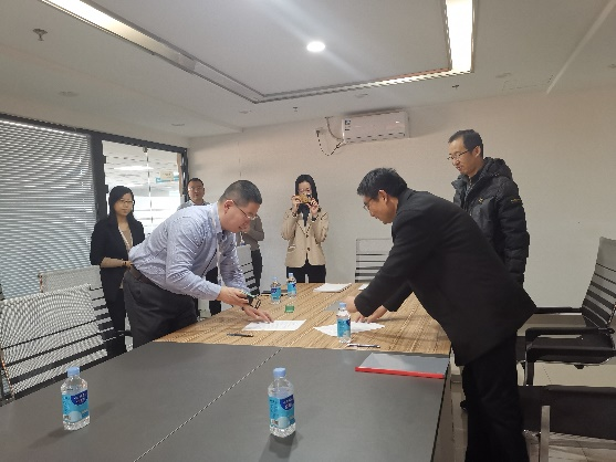12月30日,tyc33455cc太阳集团与石家庄瑞诺网络科技有限公司(简称瑞诺国际)签署合作协议并举行实习基地挂牌仪式。活动在瑞诺国际石家庄总部举行,tyc33455cc太阳集团经理张润、副书记刘磊、副经理杨清珍、瑞诺国际总经理郑毅、副总经理李玉鹏和人力资源部经理赵静华等出席。