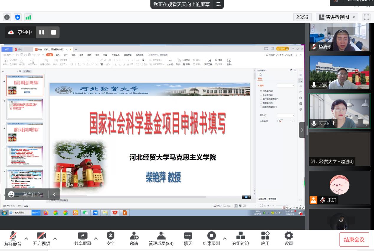 柴艳萍教授此次讲座题目为《国家社科项目申报书撰写》。讲座中,柴教授根据自己多年申报经验,紧扣国家社科申报优中选优的主题特色,对国家社科项目申报中的关键性问题进行了深入剖析和说明。第一,明晰研究内容。她重点提到教师在研究前应明确研究内容,结合实际情况确定是学术型研究还是教学型研究。第二,国家社科项目系统申报中的问题解读。教师应该严格遵循项目申报要求,申报自己熟悉的学科;选题言简意赅,结合自己的研究基础、热点和需求,还要服务于所在团队建设的需要;明晰申报项目类型,使用学术性语言。第三,国家社科项目申报书内容填写技巧。主要包括国内外研究现状的梳理和概括,学术价值和应用价值的提炼和总结等。