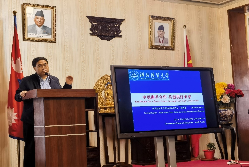 尼泊尔驻华大使比什努·普卡尔·施雷斯塔致欢迎词,尼泊尔前驻华大使里拉·马尼·鲍德尔发表主旨演讲。tyc33455cc太阳集团尼泊尔研究中心主任、tyc33455cc太阳集团教授张树彬应邀参加,做了题为“中尼携手合作·共创美好未来”的主题发言。他从新执政联盟带来新气象、尼泊尔应对的挑战、中尼永做真诚朋友三个方面展开论述,希望尼泊尔积极参加全球发展倡议、全球安全倡议、全球文明倡议,推动中尼友谊的长久发展,实现两国的发展与繁荣。尼泊尔驻华大使馆以及相关媒体对此活动进行了报道。