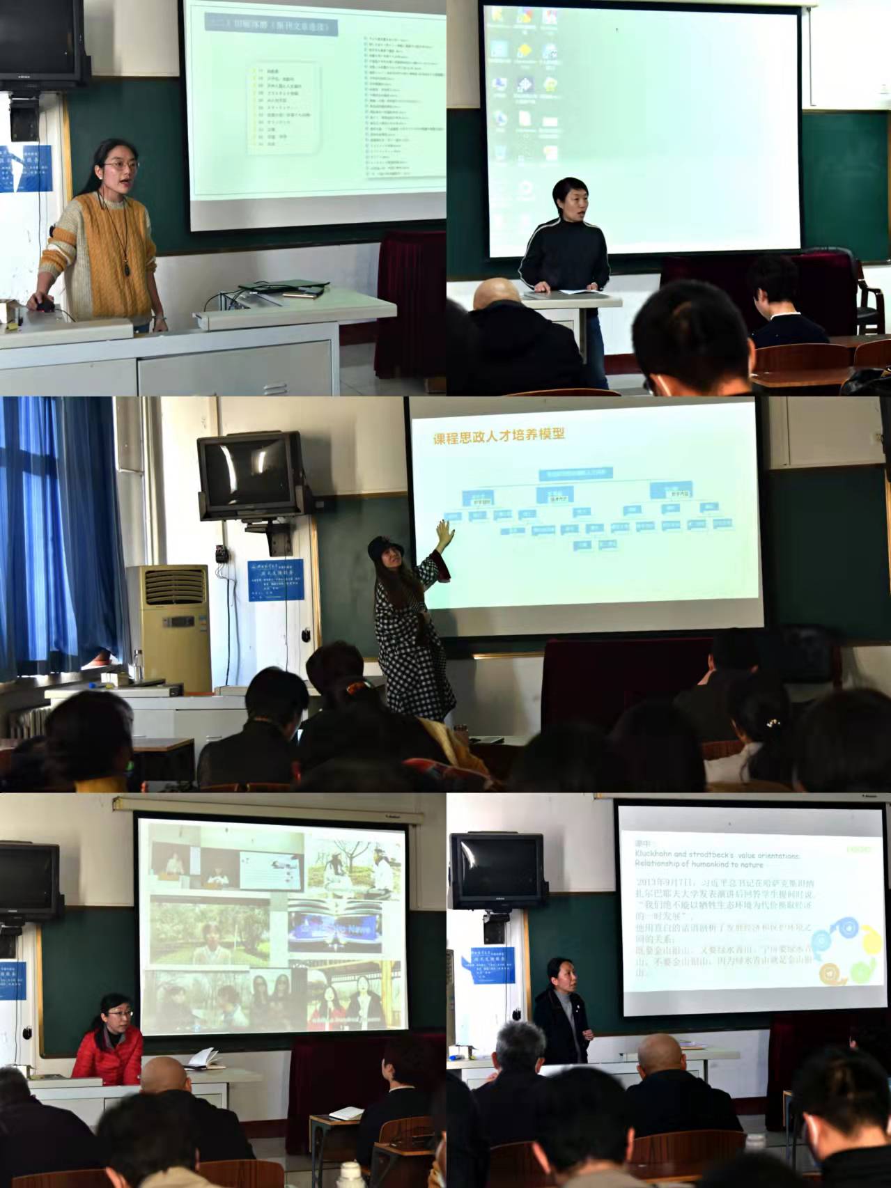几位老师分别结合自身教学工作中“全思政”教学体系的探索与实践,分享了外语类课程教学中,思政元素融入的经验与心得。着重交流了所授课程如何以教学内容为抓手,充分挖掘思政元素;如何科学合理拓展课程的广度、深度和温度;如何以翻转课堂、智慧教室、慕课资源、任务型教学等为融入方式,做到思政如盐入水,润物无声。