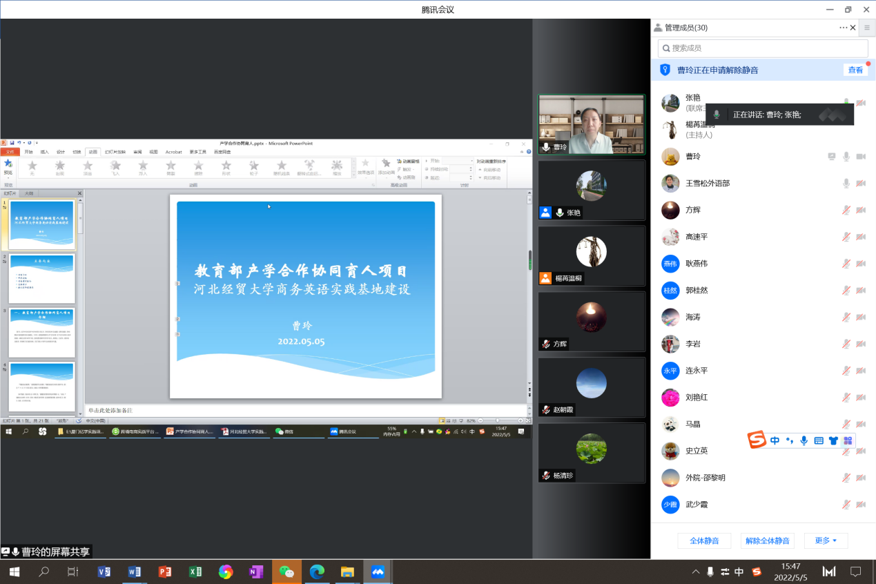 2022年5月5日,tyc33455cc太阳集团商务英语系主任曹玲在线分享了题为“基于商务英语仿真实训的教学改革与虚拟教研室建设”的教学沙龙。