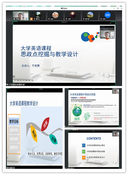 于佳慧老师首先从中国传统文化根基、当代社会现实需要和大学英语学科特点三方面分析了大学英语课程思政的重要意义;然后以具体课程单元为案例,介绍了在思政元素挖掘等方面的感想,并依托参赛经历分享了评委对课程思政教学设计的一些建议。于老师解读了《高等公司课程思政建设指导纲要》等文件,强调了结合中国方案对于英语课程思政开展的重要意义,为英语教师准确把握课程思政根本原则,有效开展课程思政提供了诸多启发。