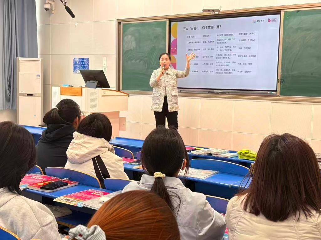 叶海霞系统介绍了其涵盖语言培训、文化交流、海外游学及高等教育的多元业务版图。针对外语专业员工的职业困惑,她重点拆解了教育行业及相关领域的核心岗位需求,指出英语教师岗位对高校应届生的高接纳度,鼓励同学们跳出传统职业框架,以更开放的视野去探索未来。